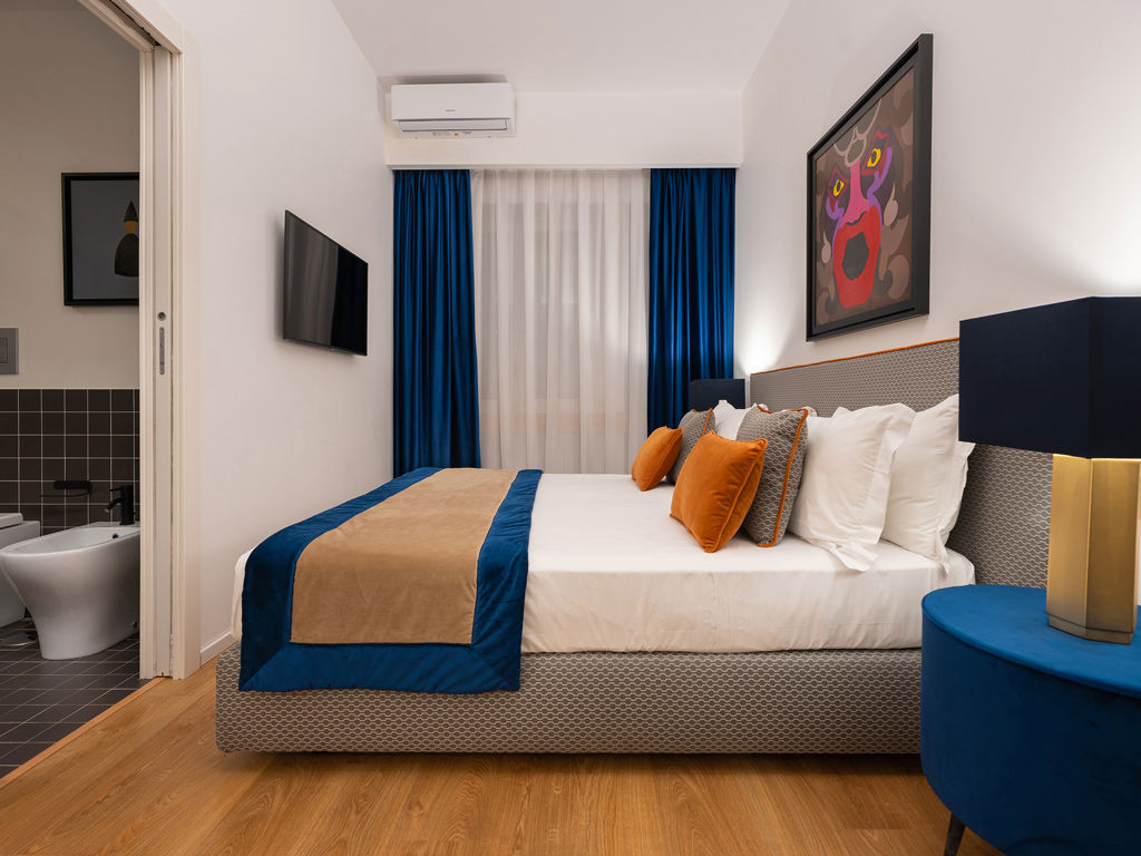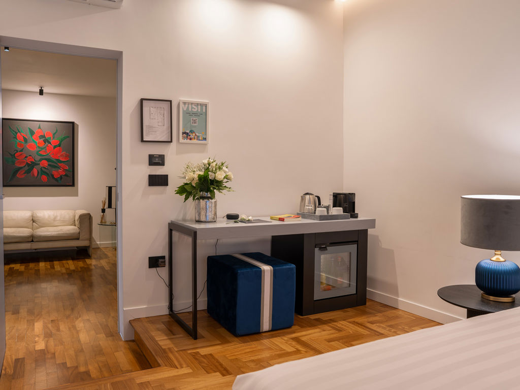It has been designed to be welcoming and functional, furnished with warm materials and carefully chosen objects. This passion for details helps to create an intimate and cozy atmosphere that transforms the room into a pleasant refuge.