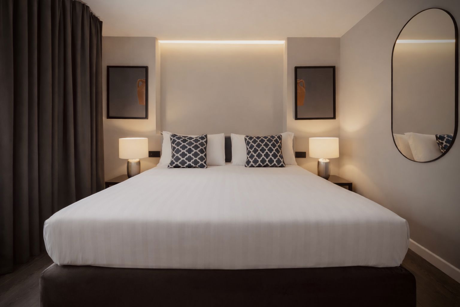 È composto da 1 spaziosa camera da letto matrimoniale, arredata in stile moderno, bagno con doccia a pavimento, un salotto con divano letto e cucina completamente attrezzata ed un balcone/finestra con vista città.
