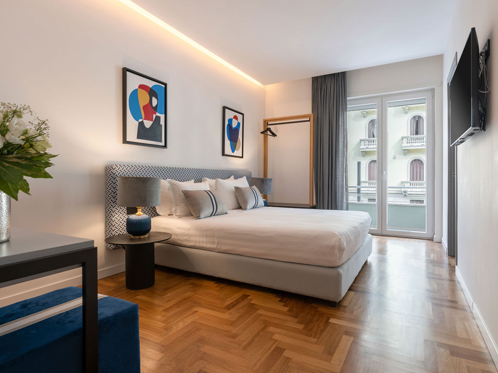 La Comfort con balcone vista città è una camera molto spaziosa (16 m²), dotata di un letto matrimoniale king-size (160 cm), o 2 letti singoli, una scrivania, appendiabiti a vista con cassettiera, un bagno privato con doccia filo pavimento ed un balcone con vista città.